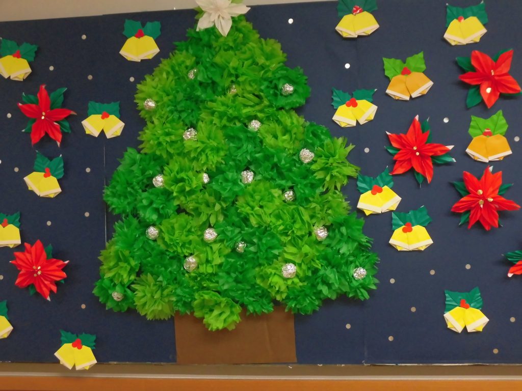 ご利用者皆さんで作成しました。お花紙のツリーに折り紙のポインセチアと可愛いベルです。