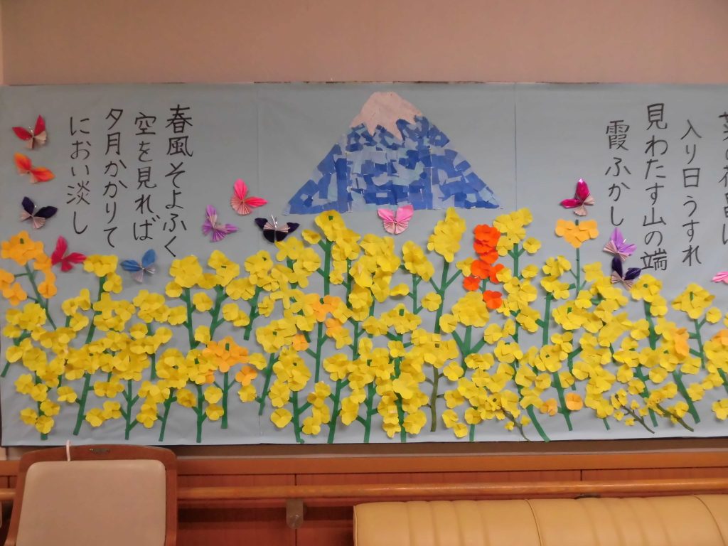 菜の花畑の間から富士山が見えます。ご利用者と一緒に完成しました。
