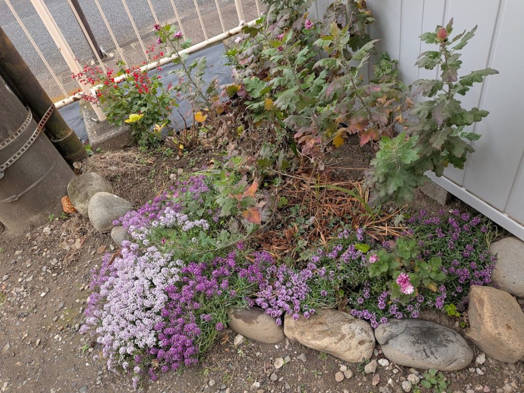 各棟の前庭や、集会所は手入れされている花壇もありますが、空き地にはお世話されない