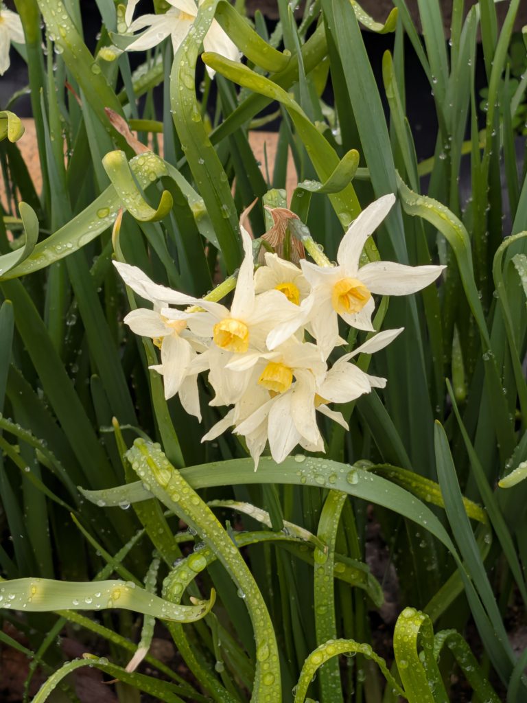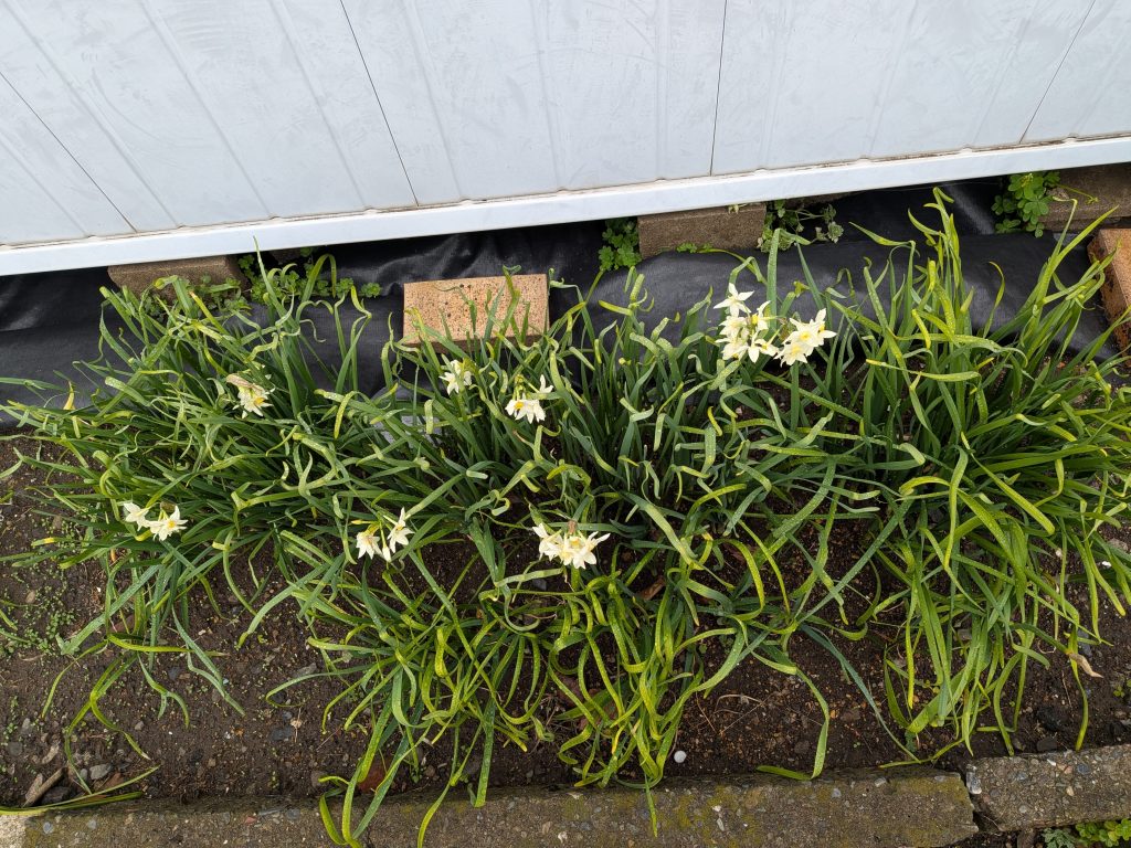 集会所の片隅に咲いています。花弁がとんがっている珍しい水仙。
