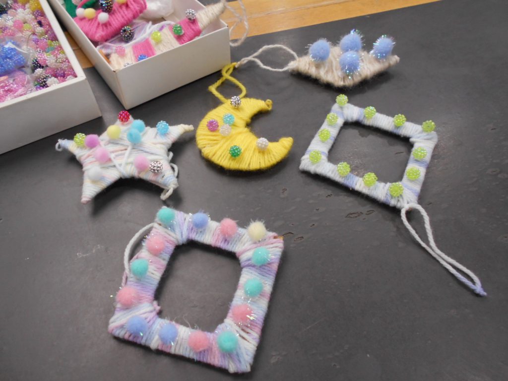 厚紙に毛糸を巻いて、カラフルなビーズなどで飾り付けを行いました。毛糸を巻く作業では、女性ご利用者が丁寧に美しく毛糸を巻いておられました。その出来栄えは職員が驚くほどでした!飾りつけをする際も、ご自身で何をどこにつけたらよいか考えながら行われており、ご利用者によって個性の光る素敵な作品となりました。