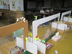 昨年のコロナ禍よりデイフロアのテーブル上に飛沫感染予防用のパーテーションを並べています。ダンボール製の物やアクリル板の物の2種類があります。