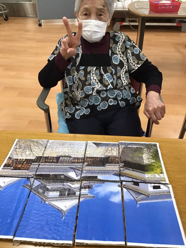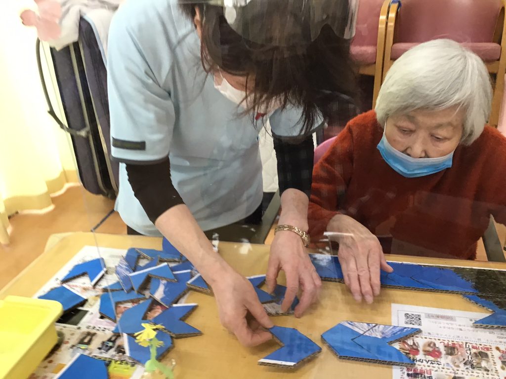 ちゃんと見本を用意したので見本に近づくよう”絵を合わせる”と言った表現に近いかもしれません。脳トレや競うゲームが得意な方が苦戦していたり、静かな方がイキイキしていたりと普段と違う利用者様のご様子が垣間見れたような気がします。