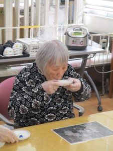 皆様に美味しく召し上がっていましたよ。明日はご飯や味噌汁を利用者様にご自身でよそっていただいた様子や、実際の食事中の写真を中心に調理レクの様子を紹介します。