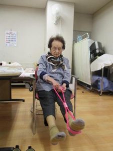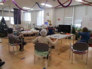 昼食後から午後のプログラムが開始するまでの小一時間、これまで利用者様方は音楽を聴いたり、縫物や折り紙をするなどしてお腹と身体を休める時間を過ごしていましたが、今月から15~20分間ほどミニリハビリコーナーを設けました。