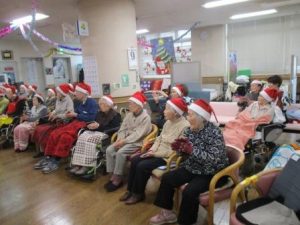 「待ってました」「イヨっ、大統領」と歓声もあがり、サンタとトナカイも堂々と花道から現れました。そして利用者様お一人お一人にサンタ(管理者)から今年一年間のご愛顧に感謝してプレゼントを配って歩きます。