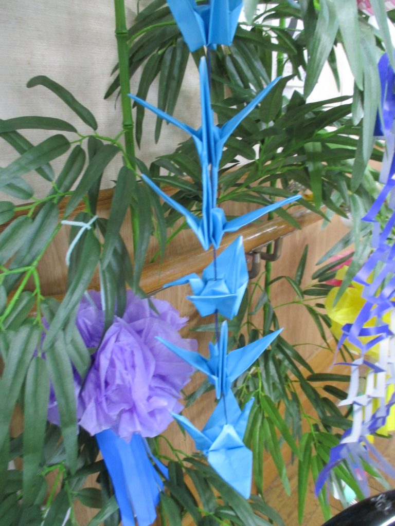 その他には折り紙で『紙飾り』を作って頂きました。例えば折り紙を輪っかにして繋げたものや、鶴、コップ等簡単なものから難しいものまで色とりどりの紙飾りができました。さっそくフロア事にの笹に飾らせていただきました。