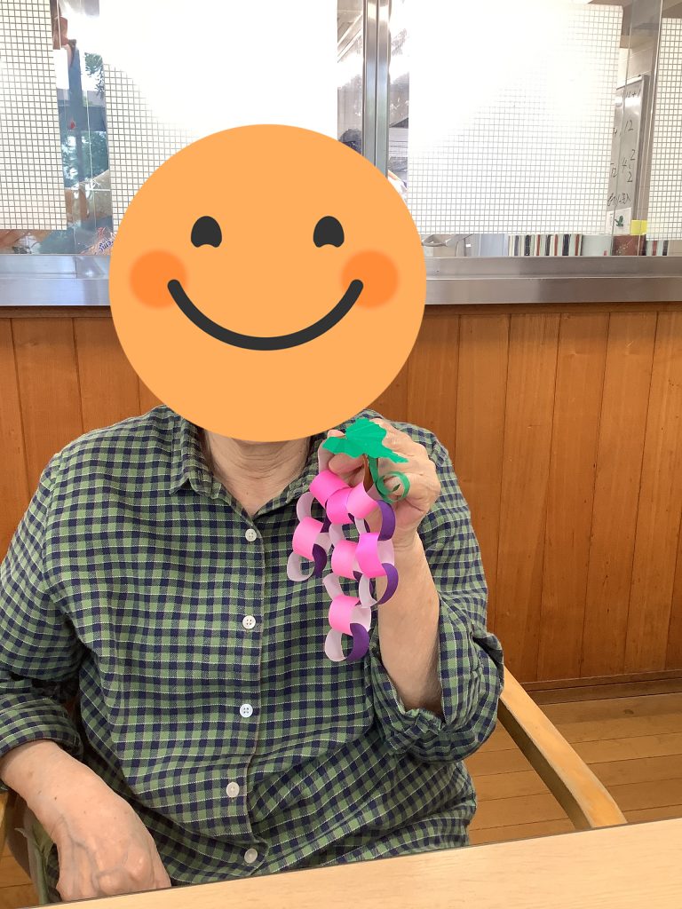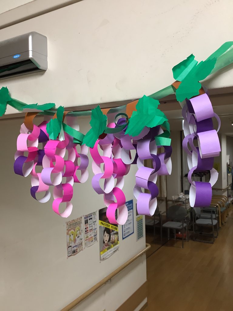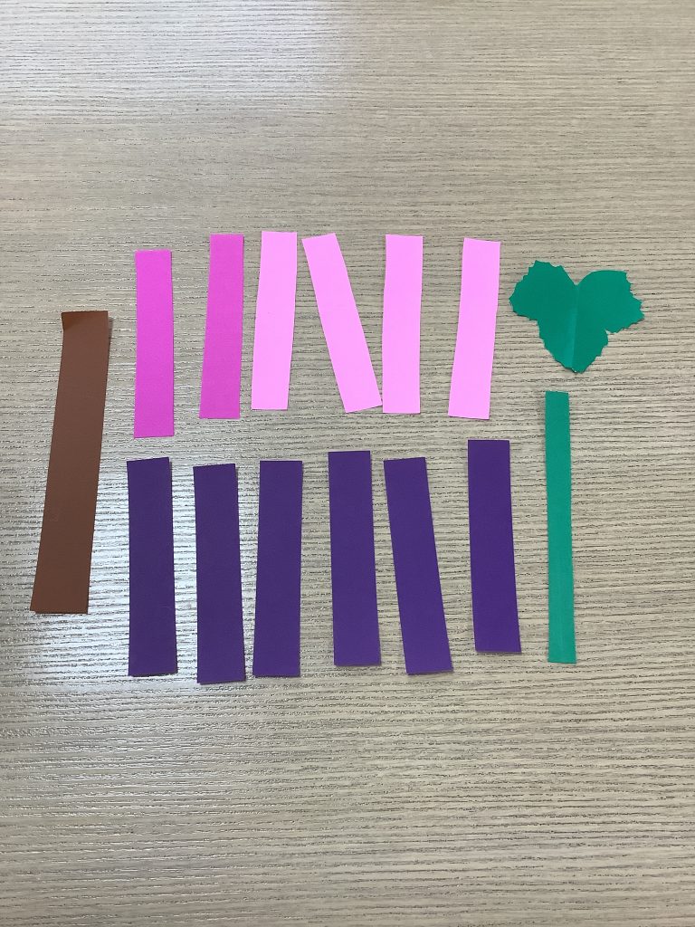 ピンクや紫の色紙をランダムに組み合わせて4枚・6枚・4枚を輪でつなぎ、ぶどうの玉を作ります。